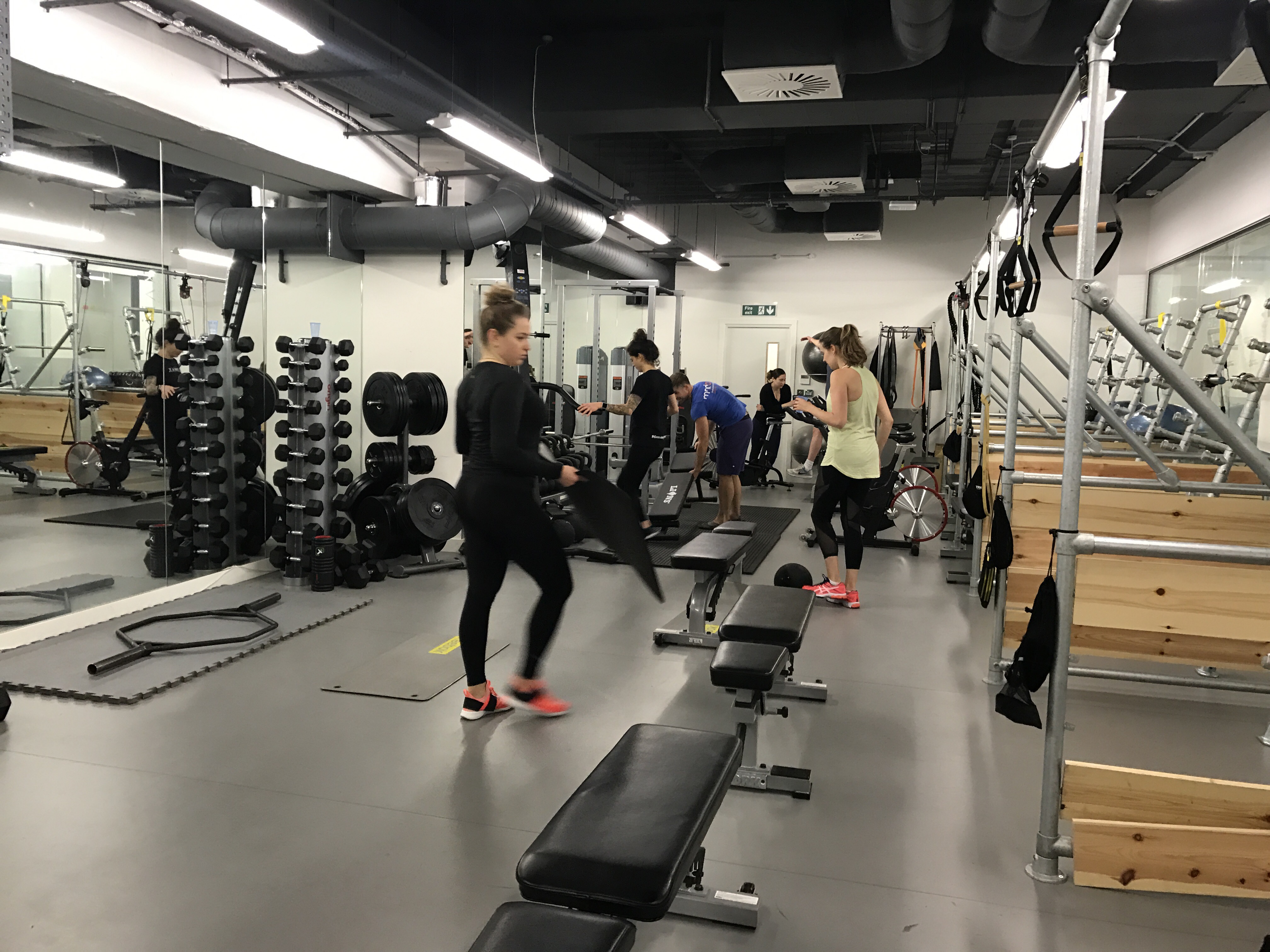 The gym is in the basement of a building, which has a cafe, ping-pong tables and lots of comfy seating. The gym itself is modern and compact. It has 8 industrial squat racks on one side, benches down the middle, free weights on the other side and some bikes at the end. The gym is set up for Personal Training and classes, so there is never an issue with lack of equpiment.
