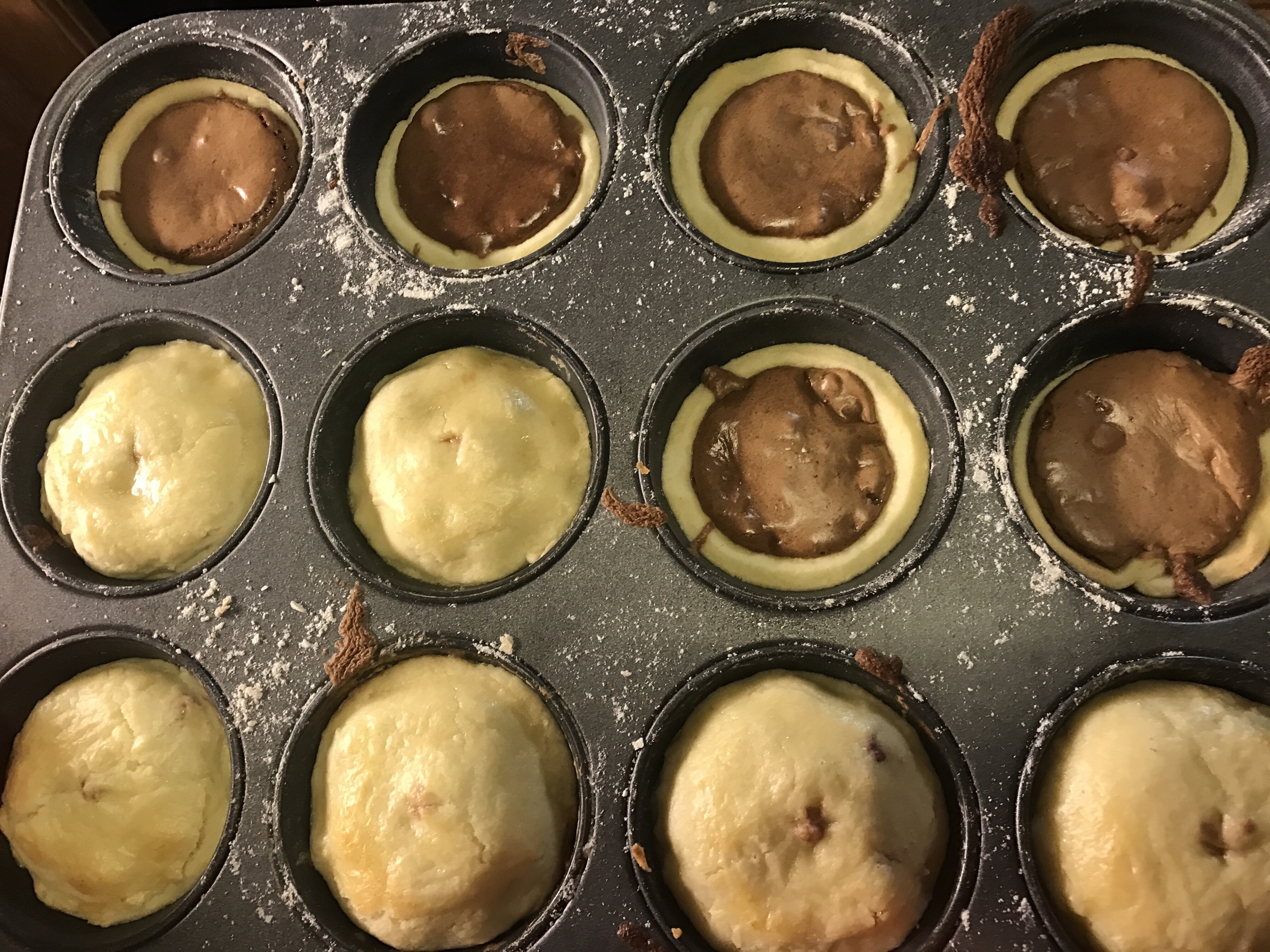 - Remove the pastry from the freezer and roll to 3mm thickness. Using a round cutter, cut out the bases and place in a muffin tray. Fill with brownie mix.