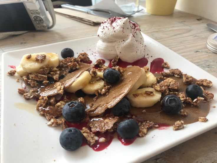 The pancakes tasted amazing. I have no idea how they were made but they tasted like caramel and had blueberries inside them. The coconut ‘mascarpone’ was delicious with the pancakes and fruit as well.