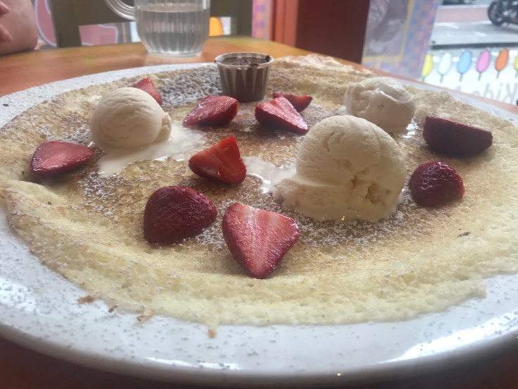 At my most recent visit I had my favourite (so far anyway), which is Nutella with fresh strawberries and ice cream! I just love chocolate and strawberries as a combination and then the added ice cream is lovely with the hot pancake. Each pancake is around 30cm in diameter, so go there feeling hungry!!