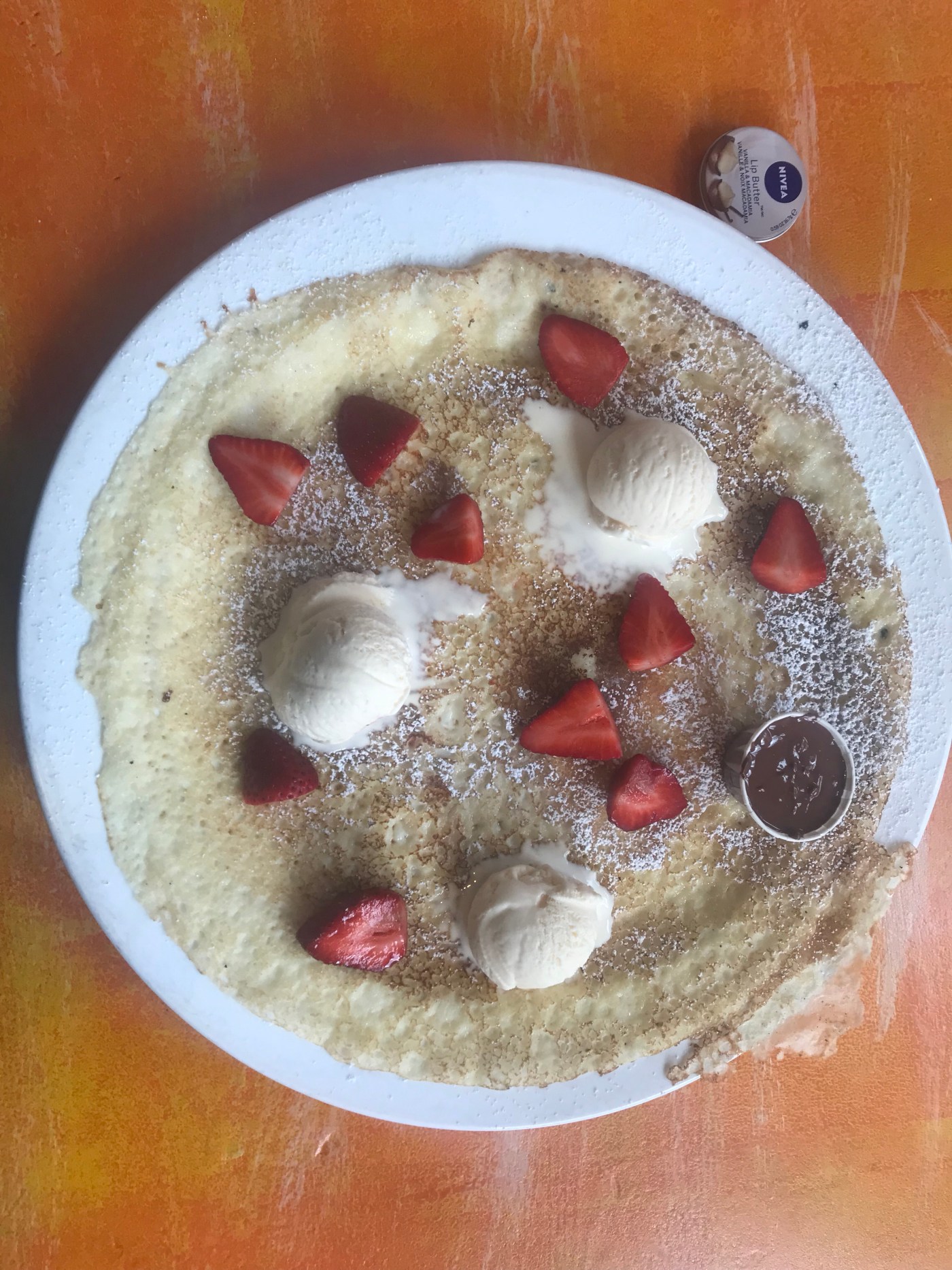At my most recent visit I had my favourite (so far anyway), which is Nutella with fresh strawberries and ice cream! I just love chocolate and strawberries as a combination and then the added ice cream is lovely with the hot pancake. Each pancake is around 30cm in diameter, so go there feeling hungry!!