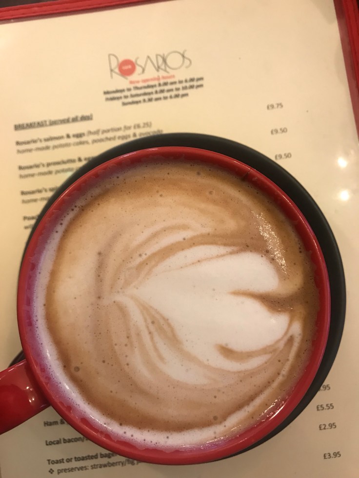 I had poached eggs with avocado, smoked salmon and gluten free bread.  I also had an almond milk mocha to wash it all down with.  Rosarios also had a great selection of gluten free cakes but I wasn’t able to try one on Saturday as I was full from our breakfast.