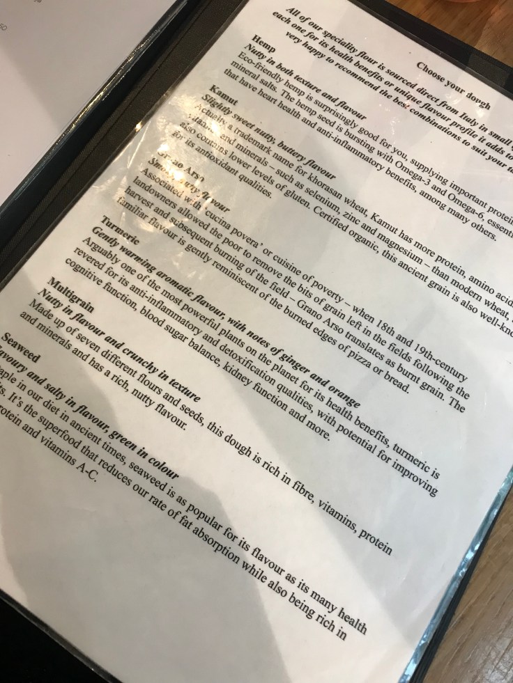I think the pièce de résistance of my gf food tour of Bath, was at Dough.  Dough have FOUR types of gluten free pizza bases – that’s right four!!! They have a standard gluten free base, a gluten free purple corn base, a gluten free turmeric base and a gluten free hemp base! How amazing is that?! If you are not following a gluten free diet, there are 7 bases to choose from.