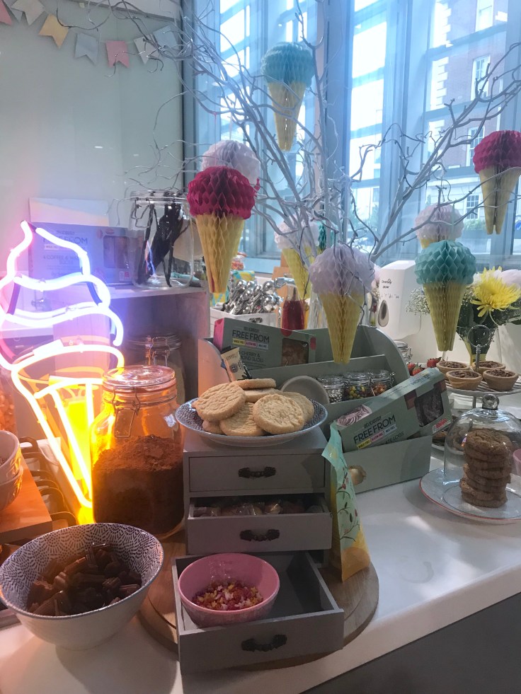 With my milkshake in one hand, I went off exploring the rest of the room filled with free from goodies and treats. As my milkshake was yellow/cream, I went with a green theme to compliment it. I topped my milkshake with whipped cream, two gluten free chocolate digestives, a gluten free brownie, star sprinkles and green and white striped straws!