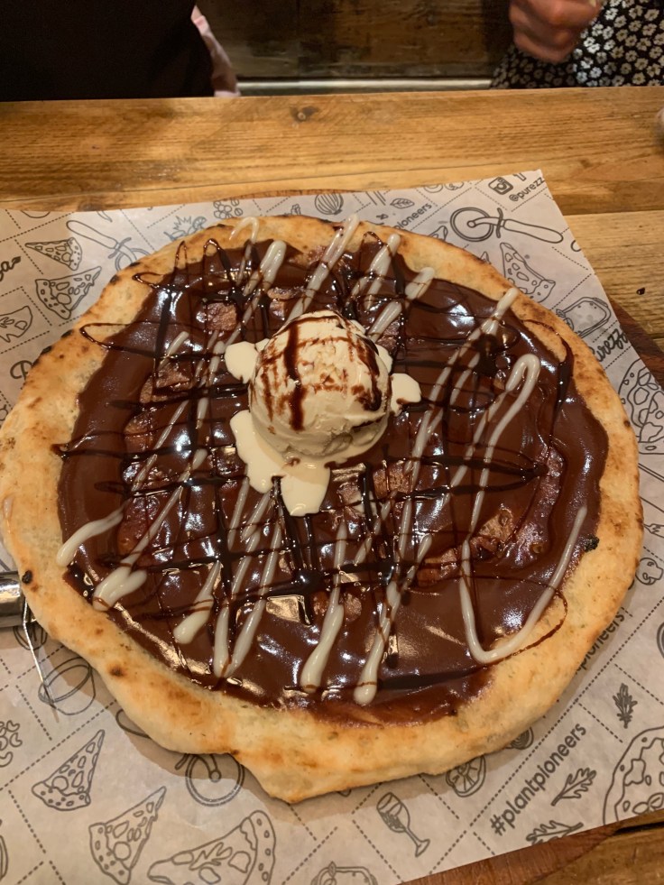 Next up were the desserts – all but one are gluten free (see the menu below). We got two desserts to share between us, the gluten free salted caramel brownie, and the star of the show, the chocolate pizza. Purezza will edit the Oreo pizza to be gluten free (by changing the base and taking off the Oreos). It is then topped with amazing dairy free chocolate and ice cream!!! I need to go back to the restaurant just for this!!