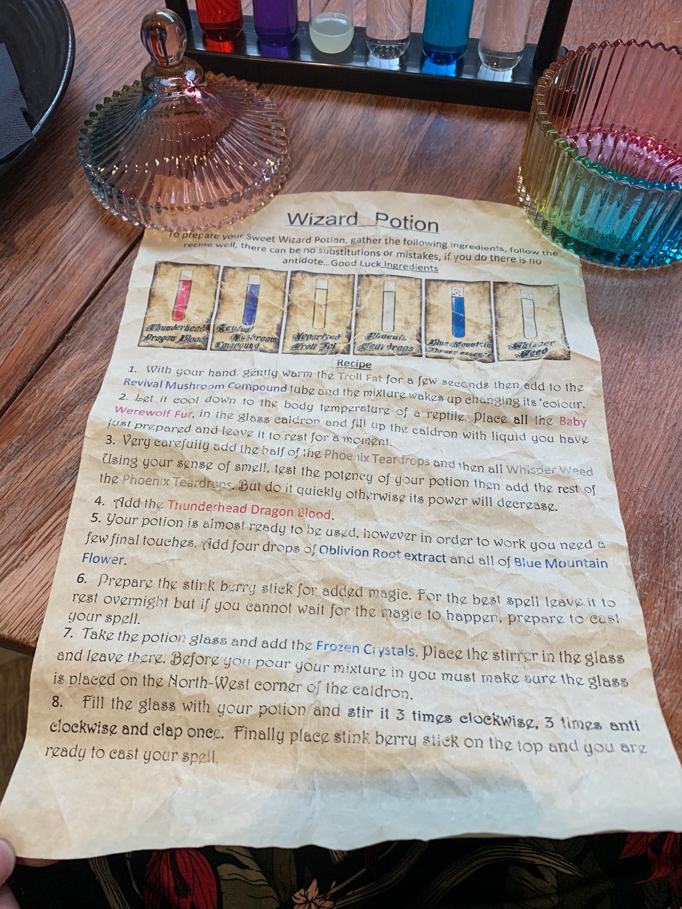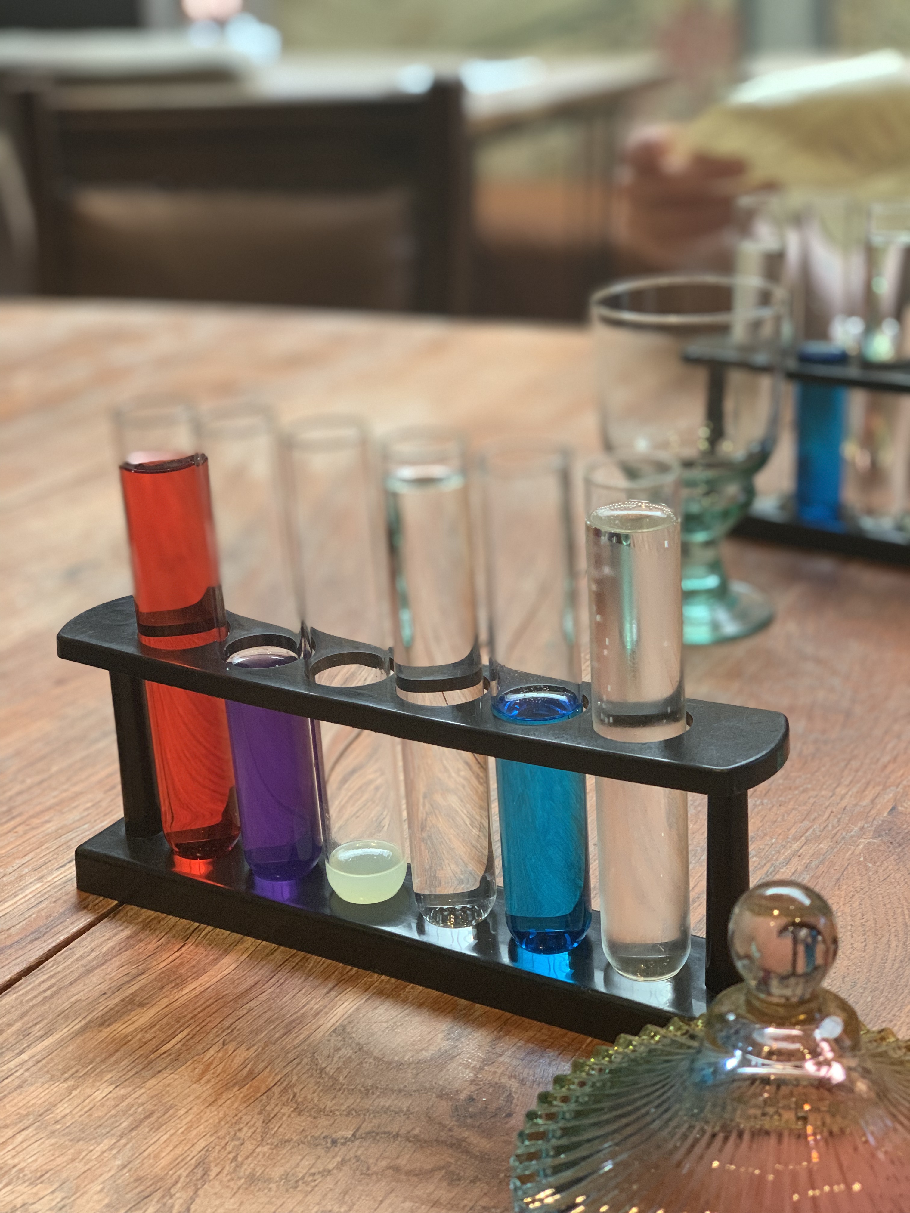 Mr FFL and I started with a potions class, to create our own cocktail, which was lots of fun!! We had 8 test tubes, a tray of extras and a recipe. The cocktail was delicious and such an interesting conception.