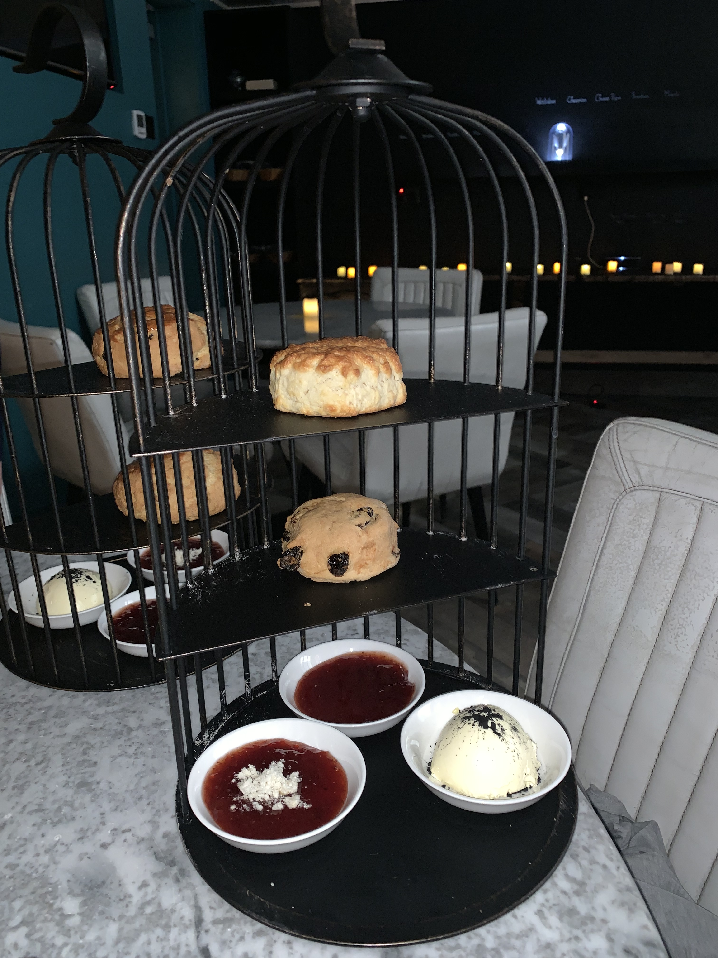Next up were the scones, a classic and a raisin scone, accompanied by clotted cream, Jam and jam with popping candy (A winner in my eyes!!). All gluten free of course.