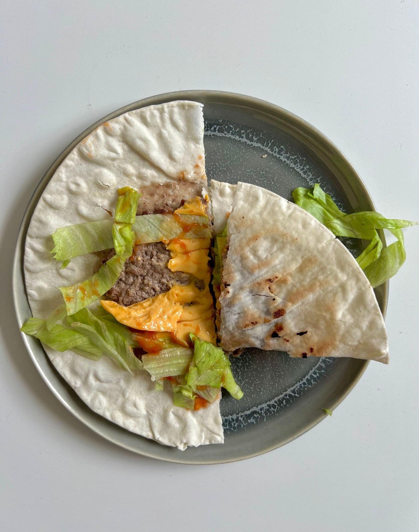 - Roll the mince into 2 small balls and then place it onto the wraps and flatten it (as far out to the perimeter as possible).